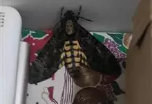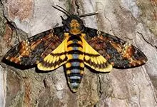 鬼脸天蛾,是鳞翅目天蛾科面形天蛾属动物。成虫翅展100~125毫米,体黑褐色;胸背有骷髅形斑纹;卵圆球形,直径约2毫米,淡黄绿色,表面光滑;老熟幼虫体长70~90毫米,蛹体长约56毫米;前翅为褐色,…全部>>