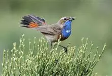 蓝点颏亦称“蓝喉歌鸲”,通称蓝靛颏儿。身体大小和麻雀相似,体长12-13厘米,体重17-18克。头部、上体主要为土褐色。眉纹白色。尾羽黑褐色,基部栗红色。颏部、喉部辉蓝色,下面有黑色横纹。下体白色。…全部>>
