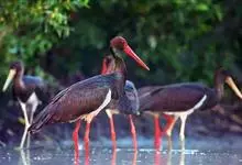 黑鹳是鹳形目鹳科鹳属鸟类,俗称乌鹳、钢鹳、老鹤。黑鹳头、颈和脊均呈黑褐色,故名黑鹳。黑鹳上体羽黑色、并带有绿紫色金属光泽,胸腹部羽白色;嘴、腿均红色;两性相似;成鸟嘴长而直,基部较粗,…全部>>