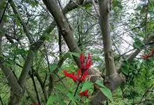 刺桐,是豆科刺桐属乔木植物。树皮灰褐色;分枝有圆锥形黑色皮刺;叶柄无毛,无刺;花密集,成对着生;花梗被茸毛,花冠红色;果实为圆柱形,微弯曲;花期3月;果期8月。刺桐因枝干间有圆锥形棘刺,故名。…全部>>