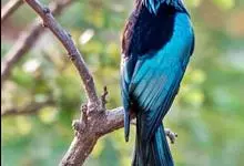 发冠卷尾是中型鸟类,体长28-35厘米。通体绒黑色缀蓝绿色金属光泽,额部具发丝状羽冠,外侧尾羽末端向上卷曲。栖息于海拔1500米以下的低山丘陵和山脚沟谷地带,多在常绿阔叶林、次生林或人工松林中活动。…全部>>