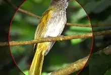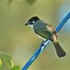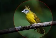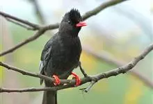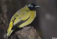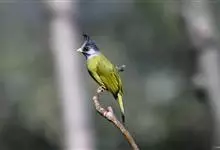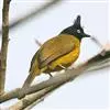 黑冠黄鹎:体长18-21厘米,是一种中等体型偏黄色鹎。整个头、颈、颏、喉黑色,头顶有显著直立的羽冠,黑色,上体褐橄榄黄绿色,下体橄榄黄色。虹膜偏红;嘴及脚黑色。…全部>>