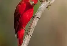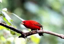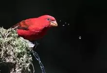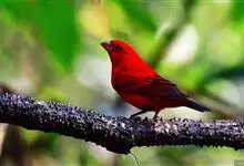 血雀雀科朱雀属鸟类,体重36-49克;体长155-182毫米。雄鸟除眼先、翼与尾为黑色外,通体为鲜红色;嘴鲜黄;雌鸟暗橄榄绿色,羽端较淡或带黄色;腰鲜黄;嘴较暗。虹膜褐色;嘴黄色;腿和脚褐色。…全部>>