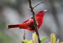 普通朱雀是雀形目雀科朱雀属鸟类,又名红朱雀、马料、青麻料。雄鸟上体红色,下体淡红色;头部、喉部、胸部及腰部亮红色;背部褐色染红色;两翼及尾黑褐色,羽缘染红色。雌鸟上体橄榄褐色,下体近白色,…全部>>