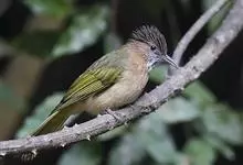 凤头雀嘴鹎:属小型鸟类,体长18-22厘米。嘴粗短、呈象牙色或乳黄色,前额和脸灰色,头顶黑色,有一朝前竖立的黑色羽冠。上体橄榄绿色,下体黄绿色,尾羽黄绿色具宽阔的黑褐色端斑。…全部>>