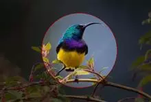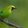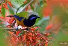 蓝翅叶鹎:小型鸟类,体长15-18厘米。雄鸟通体草绿色,尾蓝绿色,肩和翅亮蓝 色,胸缀有黄色,颏、喉黑色。雌鸟颏,喉蓝绿色。栖息在海拔1500米以下的常绿阔叶林、次生林和林缘疏林灌丛中。…全部>>