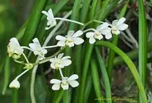 风兰 H.H.Hu):植株高8-10厘米。茎长1-4厘米,稍扁,被叶鞘所包。叶厚革质,狭长圆状镰刀形。总状花序长约1厘米,具2-5朵花;花白色,芳香;花瓣倒披针形或近匙形,长8-10毫米,…全部>>