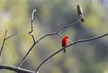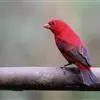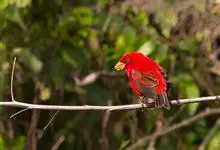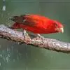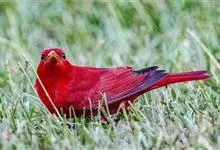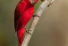 血雀雀科朱雀属鸟类,体重36-49克;体长155-182毫米。雄鸟除眼先、翼与尾为黑色外,通体为鲜红色;嘴鲜黄;雌鸟暗橄榄绿色,羽端较淡或带黄色;腰鲜黄;嘴较暗。虹膜褐色;嘴黄色;腿和脚褐色。…全部>>