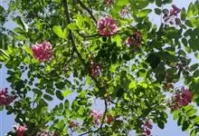 红花刺槐是豆科刺槐属的植物。其干皮深纵裂;枝具托叶刺,羽状复叶互生,叶片卵形或长圆形,具芒尖;基部圆形。花两性;总花序下垂;花冠粉红色,芳香;果条状长圆形,腹缝有窄翅。花期4~5月,果期9~10月。…全部>>