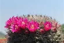 仙人掌科乳突球属原产墨西哥,通常单生,茎圆桶形,径粗9-10cm,高25-30cm,深绿色。棱13-21,放射刺20-30,中刺7-15,长2cm,红褐色。花色紫红。喜温暖干燥和阳光充足环境。较耐寒,…全部>>