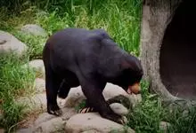 马来熊,是食肉目熊科马来熊属哺乳动物。体胖颈短,眼睛和耳朵小;头部短圆;全身乌黑光滑;鼻唇周为棕黄色,裸露无毛;眼圈为灰褐色,趾基部连有短蹼;胸斑中央有一个毛旋,颈部周围的一圈皮肤极松弛,…全部>>