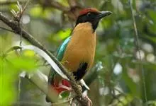 绿胸八色鸫:是雀形目八色鸫科的鸟类,共有12个亚种。体长为16-18厘米,体重65-69克。体型圆胖,尾短,腿长。头黑,上体绿色,两翼深色而具白色斑纹,头顶至后枕深褐,胸及腹部苹果绿,臀亮红。…全部>>