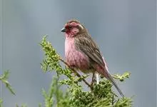 藏朱雀:全长约17-18厘米。雄鸟头部深红色具光辉,喉部暗红色具白色点斑;背部灰白色,各羽具玫瑰红色羽端,形成许多斑纹;腰部淡玫瑰红色;翅暗褐色,沾灰白,羽端沾玫瑰红或灰白色;尾暗棕色,端缘玫瑰红色…全部>>
