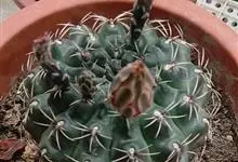 绯花玉 Speg.)是仙人掌科、裸萼球属多肉植物,植株呈扁球形,表皮墨绿色,刺针状,每个刺座有5枚灰色周刺,花生于球体顶端,夏季开花,花色有白、粉红、深红等。果实纺锤形,深灰绿色,种子黑色。…全部>>