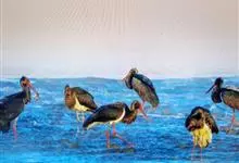 黑头鹮鹳:大型涉禽。体长102厘米,翼展150-175厘米,体重2050-2640克。寿命10年。嘴长而粗壮,飞时头颈伸直。雌雄相似。成鸟上体白色,下体白色。翼下覆羽有黑色横带,具绿色光泽和白色羽缘。…全部>>