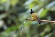 黑冠黄鹎:体长18-21厘米,是一种中等体型偏黄色鹎。整个头、颈、颏、喉黑色,头顶有显著直立的羽冠,黑色,上体褐橄榄黄绿色,下体橄榄黄色。虹膜偏红;嘴及脚黑色。…全部>>