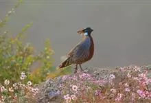 红腹角雉属于鸡形目雉科,雄鸟体羽及两翅主要为深栗红色,满布具黑缘的灰色眼状斑,下体灰斑大而色浅。雌鸟上体灰褐色,下体淡黄色,杂以黑、棕、白斑。全部>>