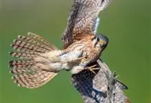红隼:是隼科、隼属的小型猛禽之一。体重173-335克,体长305-360毫米。翅狭长而尖,尾亦较长,外形和共同爪隼非常相似。雄鸟头蓝灰色,背和翅上覆羽砖红色,具三角形黑斑;腰、尾上覆羽和尾羽蓝灰色,…全部>>