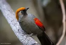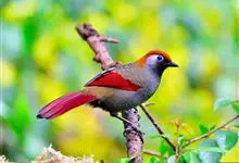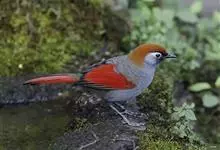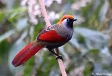 赤尾噪鹛中型鸟类,体长24~28厘米。头顶至后颈红棕色,两翅和尾鲜红色,眼先、眉纹、颊、颏和喉黑色,眼后有一灰色块斑。其余上下体羽大都暗灰或橄榄灰色。特征极明显,特别是通过鲜红色的头顶、翅和尾。…全部>>
