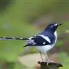 斑背燕尾是鹟科、燕尾属中型鸟类,体长24-25厘米。额至头顶前部白色,其余头、颏、喉、胸黑色,后颈有一白领,背黑色具圆形白色斑点,腰白色,两翅黑色具白色翅斑,尾呈深叉状,黑色、具白色端斑。…全部>>