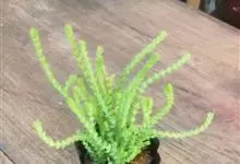 筒叶花月,是景天科青锁龙属的多年生草本植物。植株多分株,灌木状,茎较粗壮,圆柱形,表皮灰褐色;叶片肉质,互生,呈圆筒状,簇生于茎或分枝顶端,叶端呈斜截形,截面为椭圆形;花呈星状,淡白色;花期秋季。…全部>>