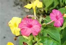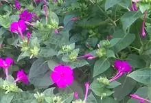 即紫茉莉,英文名:Four-o'clock,Marvel of Peru,为紫茉莉科、紫茉莉属多年生草本植物,一年生栽培。株高50~80cm。根粗壮,茎多分枝而散生。叶对生,卵形或心脏形。花数朵簇生…全部>>