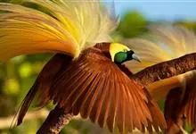 大极乐鸟是极乐鸟属中最大的鸟种。成年雄鸟体长可达到43厘米,雌性可达35厘米。雄鸟的额、颊、喉等墨绿色;头、颈黄色;上体暗赤栗色;腹部葡萄红色,胁部有长饰羽,其基部橙黄,中部黄色,…全部>>