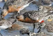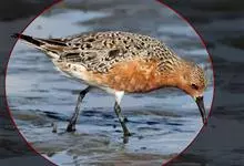 红腹滨鹬,是鹬科、滨鹬属的小型涉禽,体长23-25厘米,嘴较短而直、黑色,脚亦甚短、绿色。体较粗胖。夏季上体灰褐色具黑色中央纹,背具棕栗色和白色斑纹和羽缘,头侧和整个下体栗红色。冬季棕红色消失,…全部>>