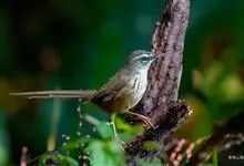 灰胸鹪莺:体长12厘米,是一种体型略小的灰褐色鹪莺。具略长的凸形尾。繁殖期成鸟:上体偏灰,飞羽的棕色边缘形成翼上的褐色镶嵌型斑纹;下体白,具明显的灰色胸带。…全部>>