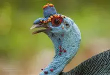 眼斑吐绶鸡:是火鸡科的两种鸟类之一。体型比普通火鸡略小些,体长1米左右,体重2.4-5.4千克,雄性比雌性略大,长得很特别,蓝色的秃脑袋上冒出几个橙黄色的疙瘩。但是它羽色艳丽,身体呈铜色及绿色。…全部>>