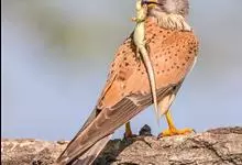 红隼:是隼科、隼属的小型猛禽之一。体重173-335克,体长305-360毫米。翅狭长而尖,尾亦较长,外形和共同爪隼非常相似。雄鸟头蓝灰色,背和翅上覆羽砖红色,具三角形黑斑;腰、尾上覆羽和尾羽蓝灰色,…全部>>