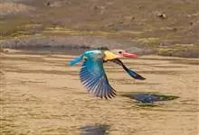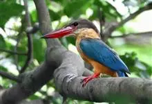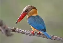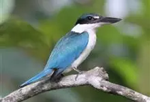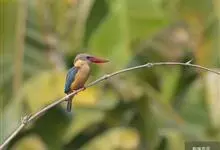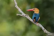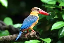 鹳嘴翡翠:体长33-37厘米。体重140-200克。共有13个亚种,体型大,嘴形巨大、侧扁,似鹳嘴,红色,嘴峰两侧有鼻沟。头灰褐色,上体蓝色,下体和宽阔的领环赭土色,脚红色。飞翔时翅上无斑。全部>>