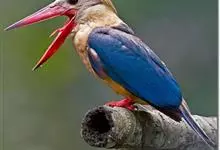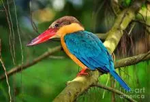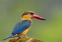 鹳嘴翡翠:体长33-37厘米。体重140-200克。共有13个亚种,体型大,嘴形巨大、侧扁,似鹳嘴,红色,嘴峰两侧有鼻沟。头灰褐色,上体蓝色,下体和宽阔的领环赭土色,脚红色。飞翔时翅上无斑。全部>>