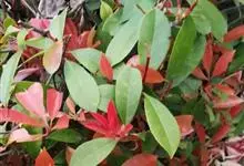 红叶石楠 是蔷薇科,石楠属杂交种,为常绿小乔木或灌木,乔木高可达5米、灌木高可达2米。叶片革质,长圆形至倒卵状、披针形,叶端渐尖,叶基楔形,叶缘有带腺的锯齿,花多而密,复伞房花序,花白色,梨果黄红色,…全部>>