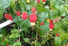 红萼苘麻是锦葵科、苘麻属常绿软木质灌木,叶绿色,长5-10厘米,心形,叶端尖,叶缘有钝锯齿,有时分裂,有细细的叶柄;叶互生,掌状叶脉;花单生于叶腋,具长梗,下垂;花萼红色,半套着大约4厘米长的花瓣,…全部>>