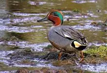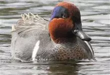 绿翅鸭是小型鸭类,体长37厘米,体重约0.5千克。嘴脚均为黑色。雄鸟头至颈部深栗色,头顶两侧从眼开始有一条宽阔的绿色带斑一直延伸至颈侧,尾下覆羽黑色,两侧各有一黄色三角形斑,在水中游泳时,极为醒目。…全部>>