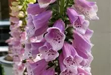 毛地黄是车前科、毛地黄属一年生或多年生草本植物。株高0.5—1米,茎直立,少分枝,全株被灰白色短柔毛和腺毛叶基生,呈莲座状,卵圆形或卵状披针形。顶生总状花序,花冠钟状,紫红色,内面有浅白斑点。菊果卵形。…全部>>
