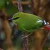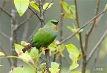火尾绿鹛是莺科、绿鹛属小型鸟类,体长11-14厘米。上体绿色,头顶至枕具黑色鳞状斑,眼先和眼后黑色,眉纹黄绿色。两翅黑色具黄色和红色翅斑及白色端斑,极为醒目。中央一对尾羽绿色,外侧尾羽鲜红色。…全部>>