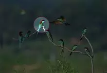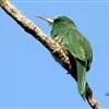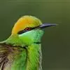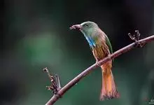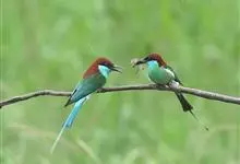绿喉蜂虎是佛法僧目、蜂虎科的小型鸟类,共有9个亚种。身长22-25厘米,翼展29-30厘米,体重15-20克。喉绿色,额部、头顶至上背为锈红色,其余上体均为亮绿色。中央尾羽延长且端段狭细,…全部>>
