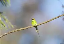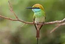 绿喉蜂虎是佛法僧目、蜂虎科的小型鸟类,共有9个亚种。身长22-25厘米,翼展29-30厘米,体重15-20克。喉绿色,额部、头顶至上背为锈红色,其余上体均为亮绿色。中央尾羽延长且端段狭细,…全部>>