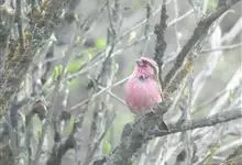 喜马拉雅白眉朱雀:小型鸟类,体长15-17厘米,体重24-35克。额基、眼先深红色,前额和一条长而宽阔的眉纹珠白色沾有粉红色并具丝娟光泽,在暗色的头部极为醒目。头顶至背棕褐或红褐色、具黑褐色羽干纹,…全部>>