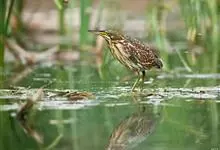 紫背苇鳽是鹭科、苇鳽属动物,为涉禽,体长约33厘米。头顶黑色,后头至尾上覆羽暗栗褐色;翅上覆羽橄榄黄色;下体浅棕黄色。多生活于水库和山脚边的稻田、芦苇丛、滩涂及沼泽草地,在西藏见于海拔2300米的农田,…全部>>