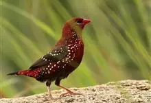 红梅花雀小型鸟类,体长9-10厘米。雄鸟通体朱红色,背、肩、胸等满布白色小斑点,两翅和尾黑褐色均具白色端斑,嘴红色,脚蜡黄色。雌鸟上体淡褐色或赭褐色,翅上中覆羽、大覆羽和内侧飞羽末端具白色斑点,…全部>>