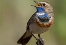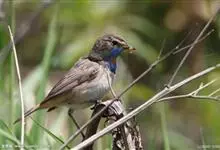蓝点颏亦称“蓝喉歌鸲”,通称蓝靛颏儿。身体大小和麻雀相似,体长12-13厘米,体重17-18克。头部、上体主要为土褐色。眉纹白色。尾羽黑褐色,基部栗红色。颏部、喉部辉蓝色,下面有黑色横纹。下体白色。…全部>>