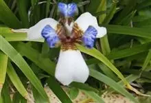 巴西鸢尾 Sprague)是鸢尾科、巴西鸢尾属多年生草本植物。株高40-50厘米。叶从基部根茎处抽出,呈扇形排列,叶片2列,叶宽约2厘米,带状剑形,革质,深绿色。花从花茎顶端鞘状苞片内开出,…全部>>
