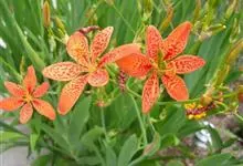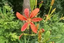 射干 Redouté)是鸢尾科射干属多年生草本植物。根状茎为不规则的块状,斜黄色或黄褐色;花橙红色,散生紫褐色的斑点;花药呈条形;子房下位,倒卵形;蒴果倒卵形或长椭圆形;种子圆球形,黑紫色,有光泽。…全部>>