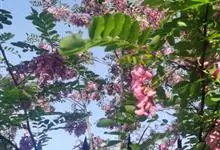 红花刺槐是豆科刺槐属的植物。其干皮深纵裂;枝具托叶刺,羽状复叶互生,叶片卵形或长圆形,具芒尖;基部圆形。花两性;总花序下垂;花冠粉红色,芳香;果条状长圆形,腹缝有窄翅。花期4~5月,果期9~10月。…全部>>
