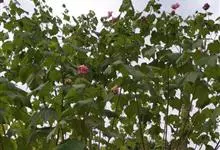 海滨木槿是锦葵科木槿属植物,落叶小乔木,株高3-5米,胸径20厘米,扁球形树冠,枝叶繁盛。厚纸质单叶互生,扁圆形、倒卵形或宽倒卵形,先端钝近平,具短突尖,基部圆形或浅心形,叶缘中上部具细圆齿,…全部>>