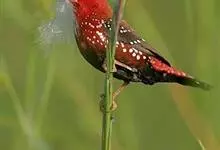 红梅花雀小型鸟类,体长9-10厘米。雄鸟通体朱红色,背、肩、胸等满布白色小斑点,两翅和尾黑褐色均具白色端斑,嘴红色,脚蜡黄色。雌鸟上体淡褐色或赭褐色,翅上中覆羽、大覆羽和内侧飞羽末端具白色斑点,…全部>>