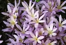 秋水仙是百合科、秋水仙属植物,多年生草本。地下部分也具有圆球形的鳞茎。它的这种鳞茎,有的直径可长至6厘米以上。球根花卉,球茎卵形,外皮黑褐色。叶披针形,暗绿色,长约30厘米。每开花1-4朵,花纺形,…全部>>